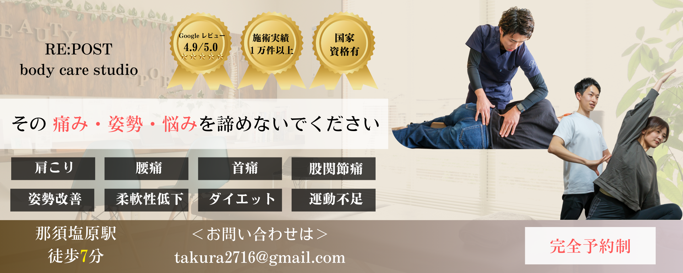 「RE:POST body care studio」では、整体で痛みを軽減し、ピラティスで膝を支える筋肉を鍛えるプログラムを提供しています。