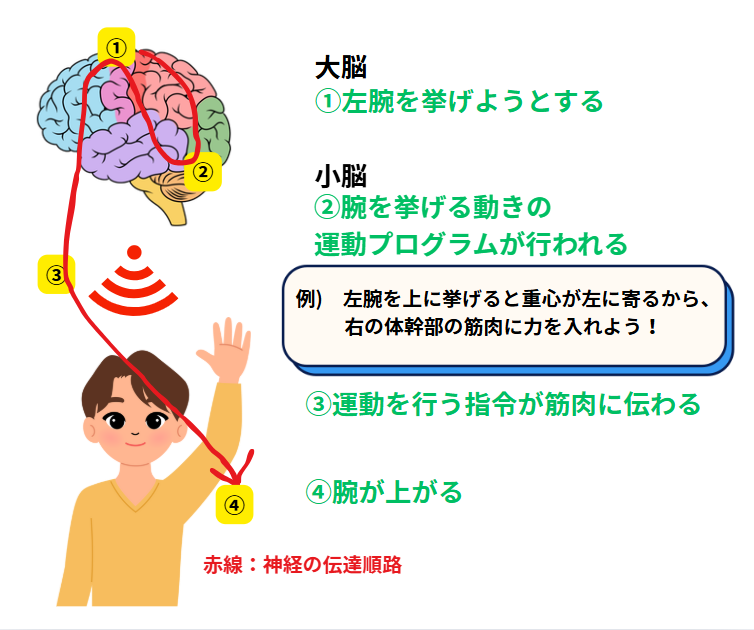 例えば、左腕を上に挙げると人の重心は左に寄り、そのままでは左側に身体が倒れてしまいます。ですが、脳で運動の制御をする領域(小脳)が、身体が偏らないように、右側の体幹部に無意識化で筋収縮を入れて、身体が左に倒れるのを防いでくれています(下記図参照)