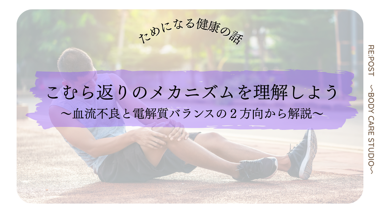 こむら返り(筋痙攣)は、単なる筋疲労だけでなく、体内の環境が複雑に絡み合って起こる現象です。本記事では、特に重要な①血流不良と②電解質バランスの乱れの観点からメカニズムを整理し、日常でできる予防策を紹介します。